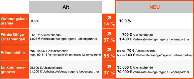 - Die Grenze der förderfähigen Einzahlungen erhöht sich von 512 bzw. 1.024 Euro auf 700 bzw. 1.400 Euro